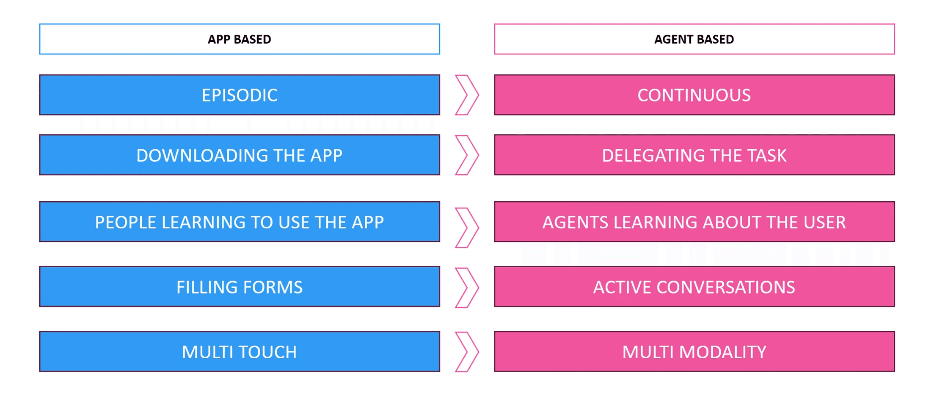 They're task-oriented, not feature-oriented. You don't navigate to a module. You tell the agent what you're trying to achieve and it figures out the sequence of actions required across whatever systems it has access to. The interface is the goal, not the menu.